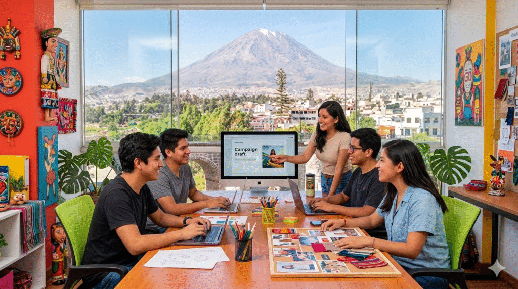 Equipo creativo en Arequipa trabajando en gestión de marketing en redes sociales para negocios peruanos